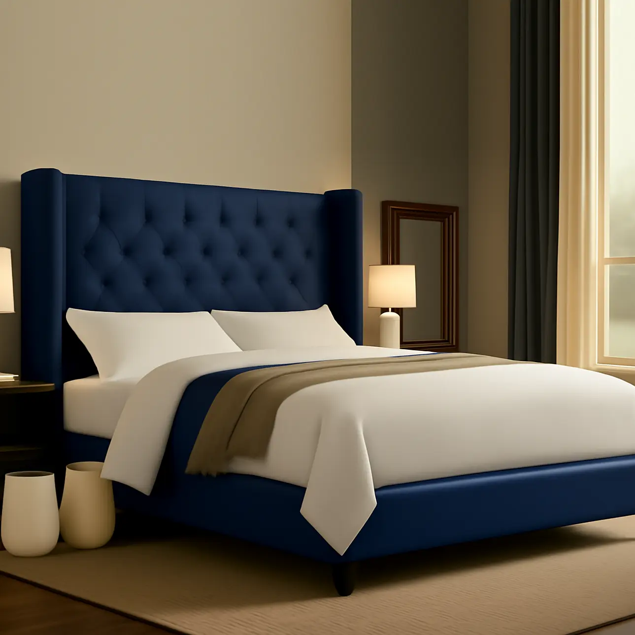 Experience opulent comfort with the Wingback Velvet Bed. The dramatic tall, button-velvet, wingback headboard transforms your bed into the focal point of your bedroom. The velvet upholstered headboard and rails provide an elegant backdrop for showcasing your personal style with bedding. The sturdy frame, adorned with espresso finish legs, creates a beautiful fusion of function and style, ensuring your Wingback Velvet Bed is not just a luxurious retreat but a statement piece in your bedroom.