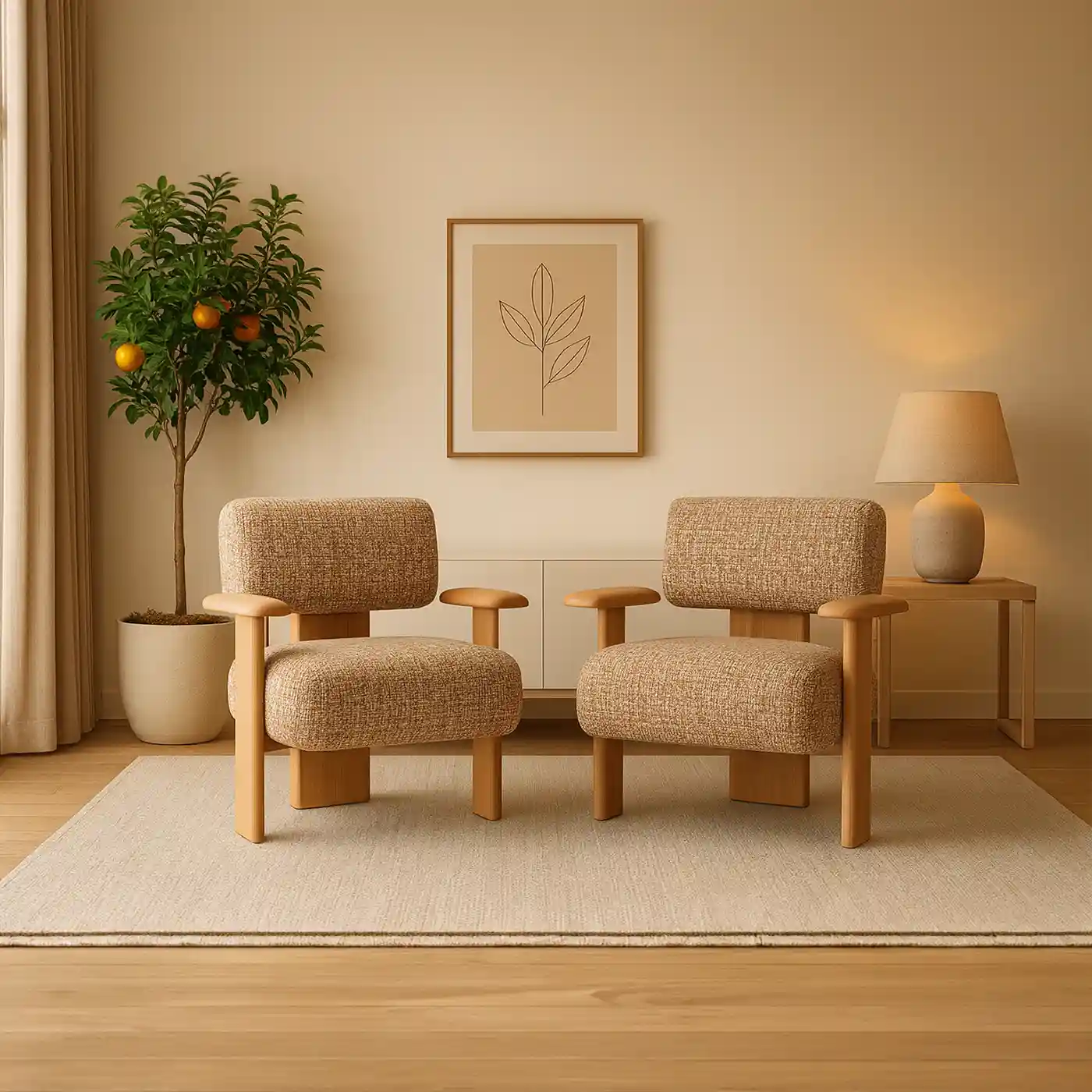 The Orchard Accent Chair blends warm wood craftsmanship with soft, textured upholstery to create a modern, organic statement piece. Designed for refined living spaces, it offers plush comfort, clean lines, and a naturally elegant silhouette; perfect for contemporary and minimalist interiors.