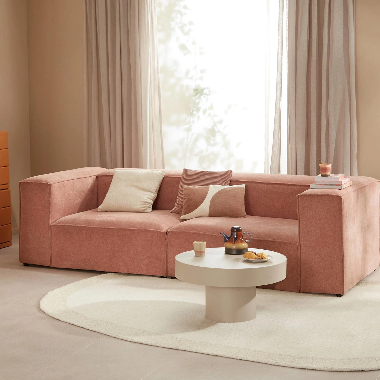 It is a Modular Sofa with earthy tones, warm presence, and rich fabric. It is a deep seating sofa, that comes with tactile softness, architectural edges, and modern design. It is an adaptable modern living room furniture that adds style and comfort to your life. The sofa comes with clean lines, a minimalist aesthetic, and adds elegant modernity to your living room.